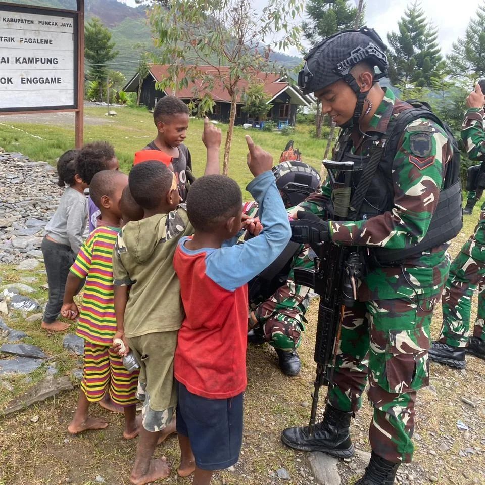 Satgas Yonif RK 115/ML Pos Pruleme menghibur anak-anak dengan membagikan permen atau biasa disebut gula-gula di Kampung Kulok Enggame, Distrik Pagaleme, Kabupaten Puncak Jaya. Selasa (12/9/2023).