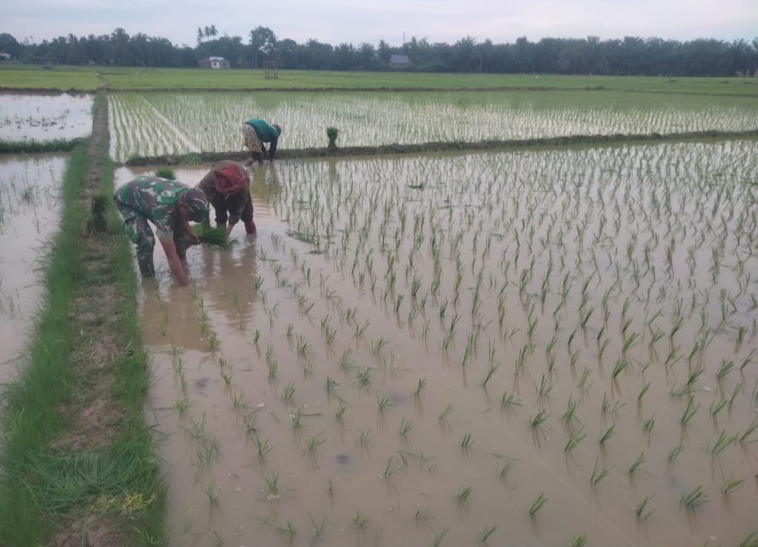 Aceh Timur – Babinsa Koramil14/Rtp Kodim 0104/Aceh Timur, Serda Syah Andrianto membantu petani menanam padi milik Ibu Halimah luas lahan 4 Rante, Agar meringankan warga dalam mewujudkan perekonomian keluarga dan meningkatkan swasembada pangan, Bertempat di Desa Tampak, Kecamatan Ranto Peureulak, Kabupaten Aceh Timur, Kamis (14/09/2023).