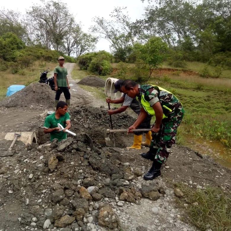 Aceh Barat – Sebagai upaya mengatasi luapan dan genangan Air ketika curah hujan tinggi, Babinsa Posramil 05/PC Kodim 0105/Abar Kopda Suwito bersama warga binaan melaksanakan Gotong Royong saling bahu membahu membuat saluran drainase sekaligus memasang Gorong – Gorong secara manual di Jalan Poros yang menghubungkan Desa Lhok Sari dan Desa Berdikari Kecamatan Pante Ceureumen, Sabtu (16/9/2023)