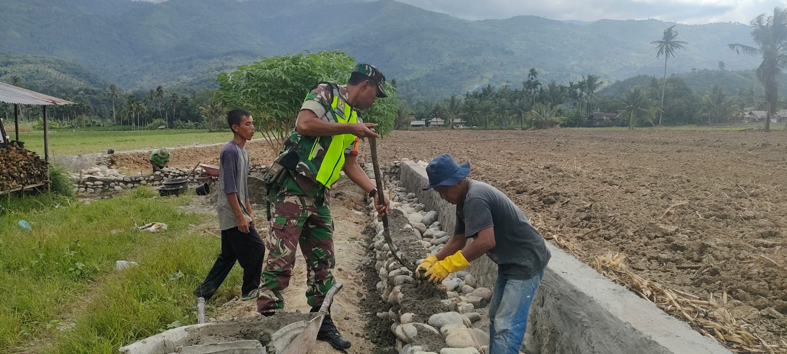 Kutacane – Babinsa Posramil Tanoh Alas Sertu Nimun jajaran Kodim 0108/Agara gotong royong bersama warga binaan dalam pembuatan saluran air irigasi sawah masyarakat bertempat Di Desa Khutung Blang kecamatan Tanoh Alas Kabupaten Aceh Tenggara, Senin (18/09/23)