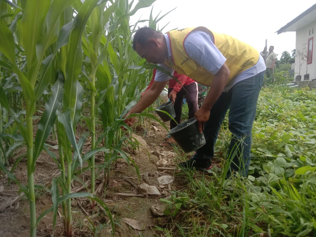 Pemupukan tanaman jagung yang ditebarkan hari ini menggunakan pupuk NPK Phonska dan urea dicampur sesuai takaran untuk mengoptimalkan pertumbuhan jagung serta kualitas buah jagung yang maksimal,” ujarnya.
