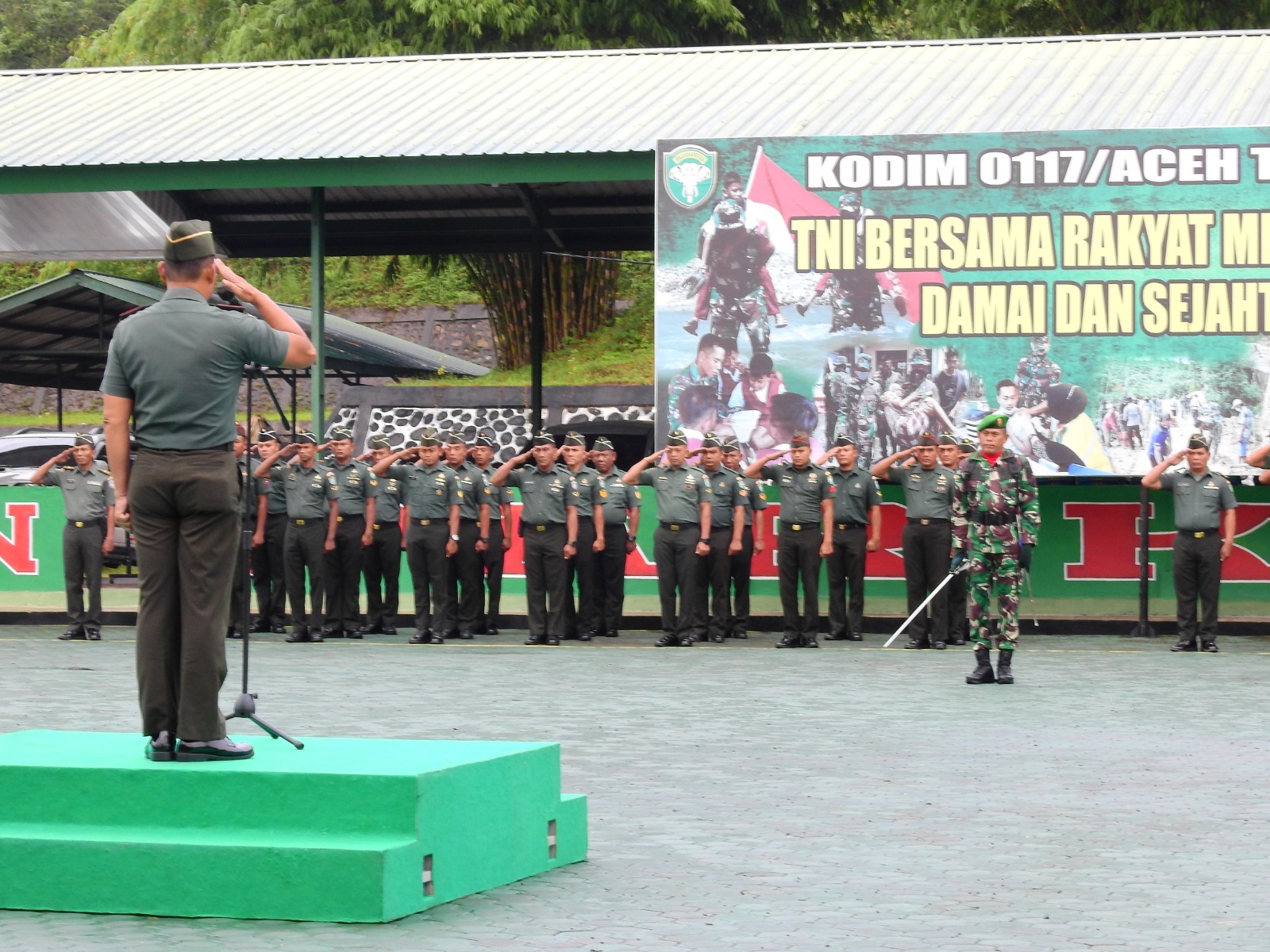 ACEH TAMIANG,MEDIA CENTER DIM 0117/ATAM- Personil Kodim 0117/Aceh Tamiang dan Jajarannya melaksanakan upacara pengibaran bendera merah putih di Lapangan Parikesit Jln. Lintas sumatera Medan-Banda Aceh Desa Sungai Liput, Kecamatan Kejuruan Muda, Kabupaten Aceh Tamiang. Senin (18/09/2023).
