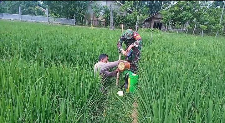 Mendukung program pemerintah dalam bidang ketahanan pangan, khususnya swasembada pangan, Babinsa Koramil 03/Dewantara, di jajaran Kodim 0103/Aceh Utara, Serda Agus Indra, melaksanakan pendampingan pada petani dalam perawatan tanaman padi di kawasan Desa Paloh Lada, Kecamatan Dewantara, Selasa (19/09/2023).