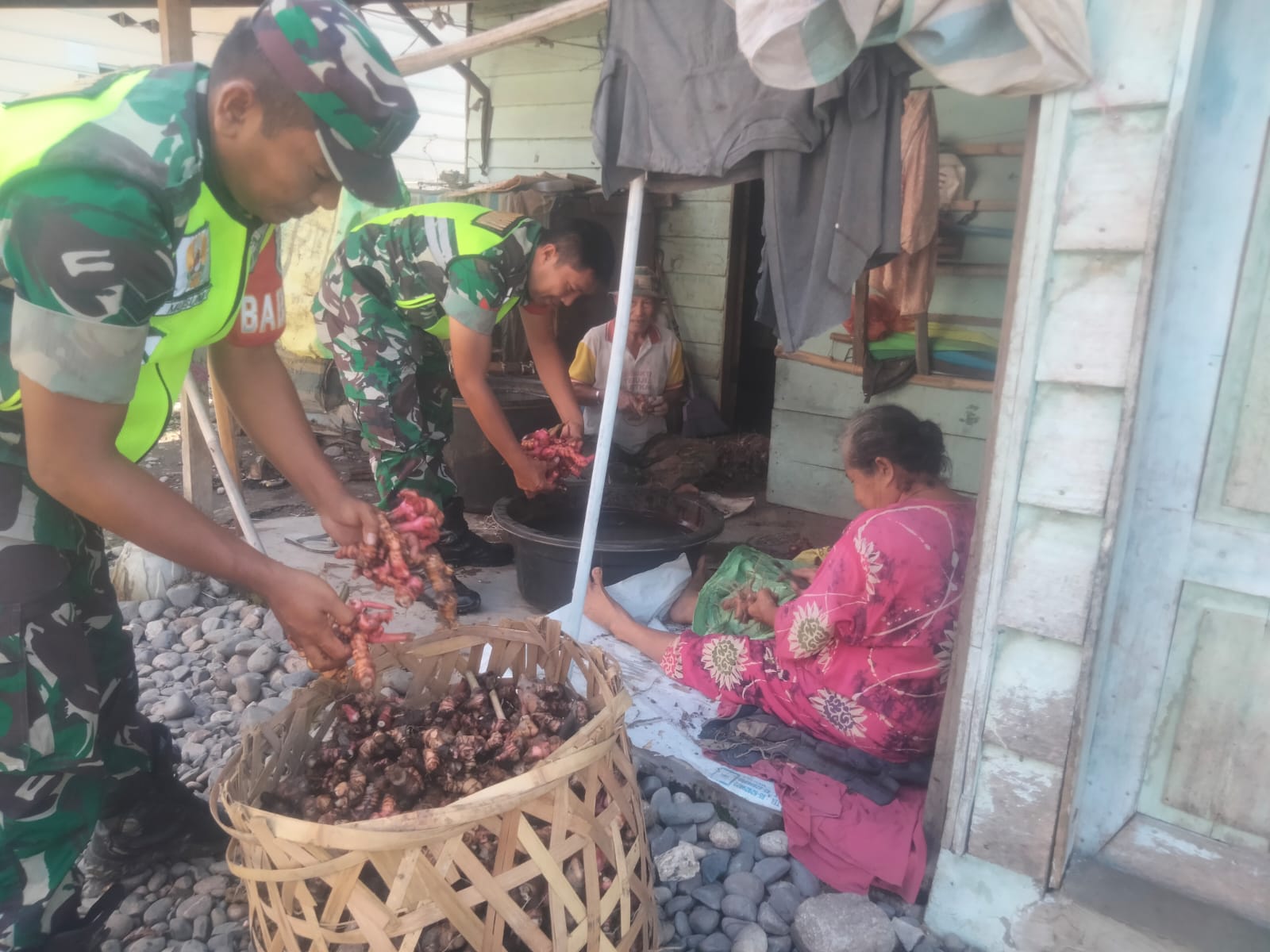 Kutacane – Babinsa Posramil Lawe Bulan Koptu Suharyanto membantu memanen dan membersihkan Hasil pertanian lengkuas ( laos) milik bapak Nudin (65) di desa kutapangguh kecamatan lawe bulan kabupaten aceh tenggara,Kamis (21/09/23).