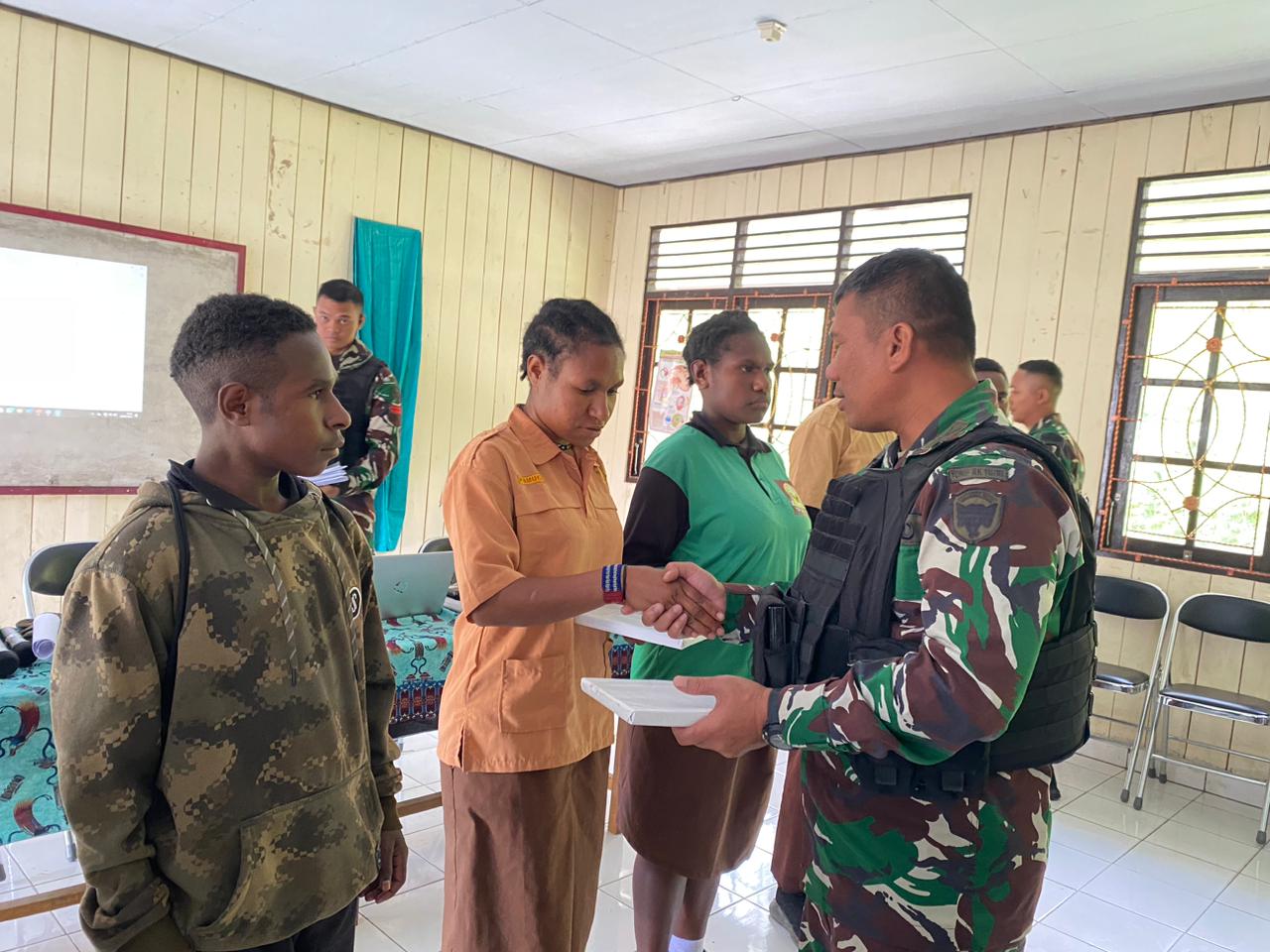Untuk menanamkan rasa cinta tanah air terhadap NKRI, Pakum Satgas Letda Chk Benaya Hendriawan, S.H. dan Pasiter Satgas Letda Inf Leonar Sirait memberikan materi wawasan kebangsaan kepada siswa-siswi SMK Negeri Mulia, yang berada di Distrik Mulia, Kabupaten Puncak Jaya. Sabtu (23/9/2023).