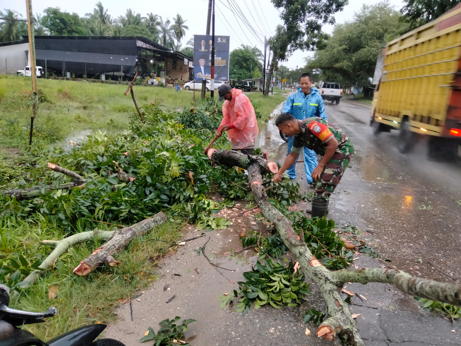 Sertu Azlin mengungkapkan dampak dari cuaca hujan lebat yang disertai angin diwilayah binaannya tersebut. adanya pohon jenis Mohoni yang tumbang mengenai sebagian badan jalan lintas sehingga mengganggu aktivitas berkendara bagi pengguna jalan.