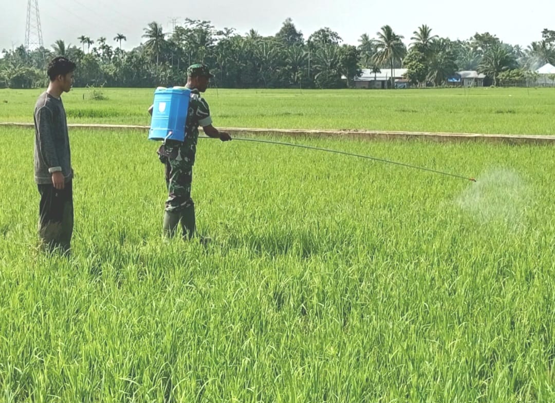 Aceh Timur – Serka Ridwan Babinsa Koramil 15/Plkb Kodim 0104/Aceh Timur, membantu petani dengan menyemprot hama pada tanaman padi milik Bapak Daut, Bertempat di Desa Tanjung Tualang, Kecamatan Perlak Barat, Kabupaten Aceh Timur, Selasa (10/10/2023).