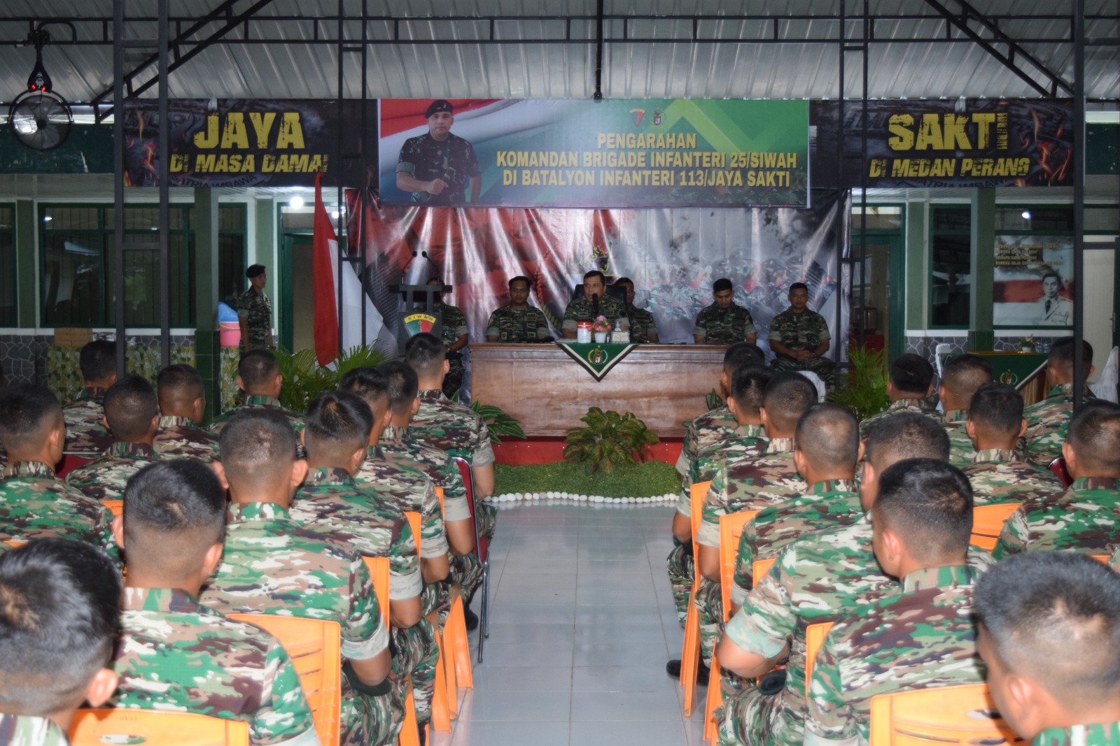 Dalam pengarahannya, Danbrigif 25/Siwah menekankan agar selalu meningkatkan keimanan dan ketaqwaan kepada Tuhan YME dengan memper banyak ibadah, hindari pelanggaran sekecil apapun terutama 8 pelanggaran berat TNI. Danbrigif 25/Siwah juga berpesan kepada seluruh prajurit Badak Hitam Yonif 113/JS agar selalu menjaga kondisi fisik dan berlatih dengan keras dan sungguh – sungguh terutama latihan tempur guna mengantisipasi bahaya perang yang bisa terjadi sewaktu waktu dimasa mendatang.