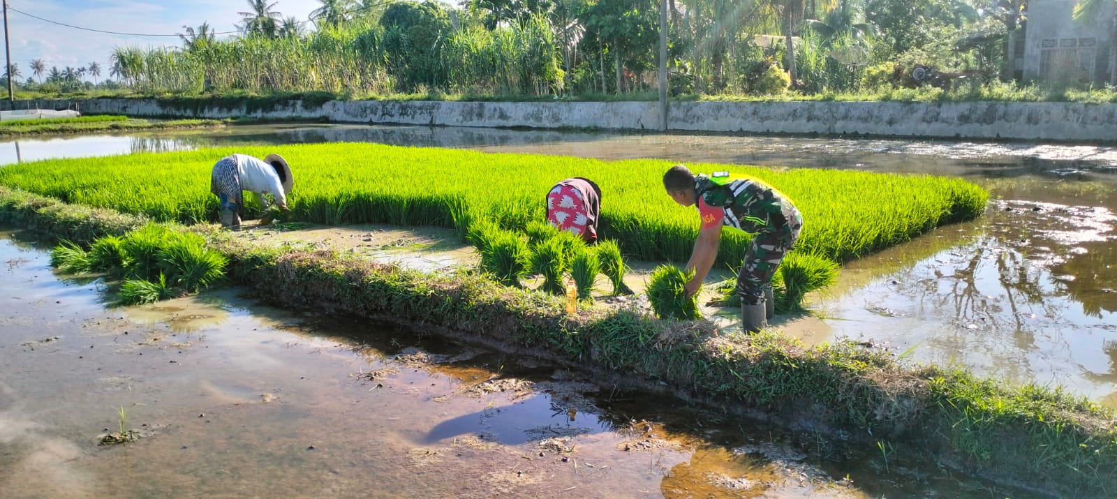 Aksi Koptu Saidul Babinsa Koramil 08/Spu Kodim 0104/Aceh Timur membantu petani dalam memindahkan bibit padi yang siap tanam, Bertempat di Desa Gampong Blang, Kecamatan Simpang Ulim, Kabupaten Aceh timur, Selasa (31/10/2023).