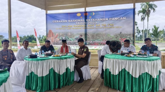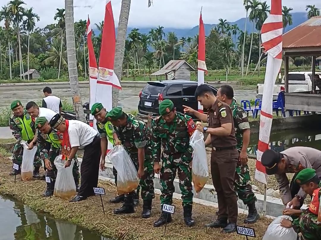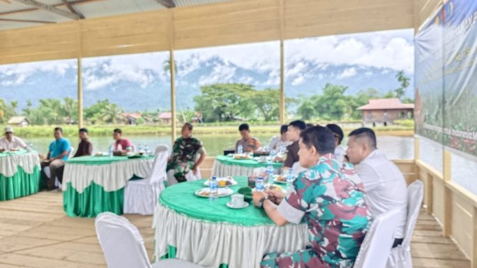 Kutacane – kodim 0108/Agara bersama jajaran Forkopimda mengikuti kegiatan dalam rangka gerakan nasional ketahanan pangan jajaran TNI melalui vidio conferene di lokasi penaburan benihbikan mas di desa lawe sagu hilir kec,Lawe Bulan Kab, Agara, kamis (02/11/23).