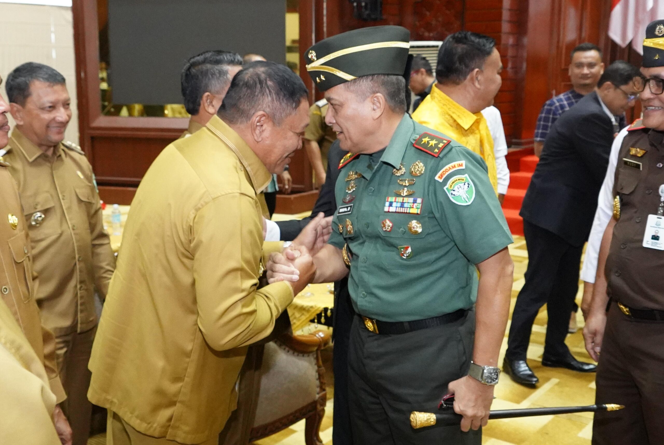 Banda Aceh – Panglima Komando Daerah Militer Iskandar Muda (Pangdam IM) Mayjen TNI Niko Fahrizal, M.Tr(Han)., menghadiri acara Musyawarah Perencanaan Pembangunan (Musrenbang) Rencana Kerja Pemerintah Aceh (RKPA) Tahun 2025 dengan tema “Mengurangi Ketimpangan Wilayah Melalui Percepatan Pembangunan Infrastruktur Strategis dan Peningkatan Pertumbuhan Ekonomi Yang Berkelanjutan” yang berlangsung di Gedung Anjong Mon Mata, Pendopo Gubernur Aceh, Kota Banda Aceh pada Senin (22/04/24) pagi.