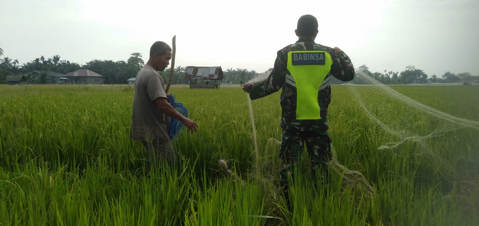 ACEH TAMIANG,MEDIA CENTER DIM 0117/ATAM- Pemasangan jaring sebagai upaya pencegahan terhadap serangan hama burung, agar padi tidak dimakan hama burung, sehingga dapat memperoleh hasil panen yang maksimal.