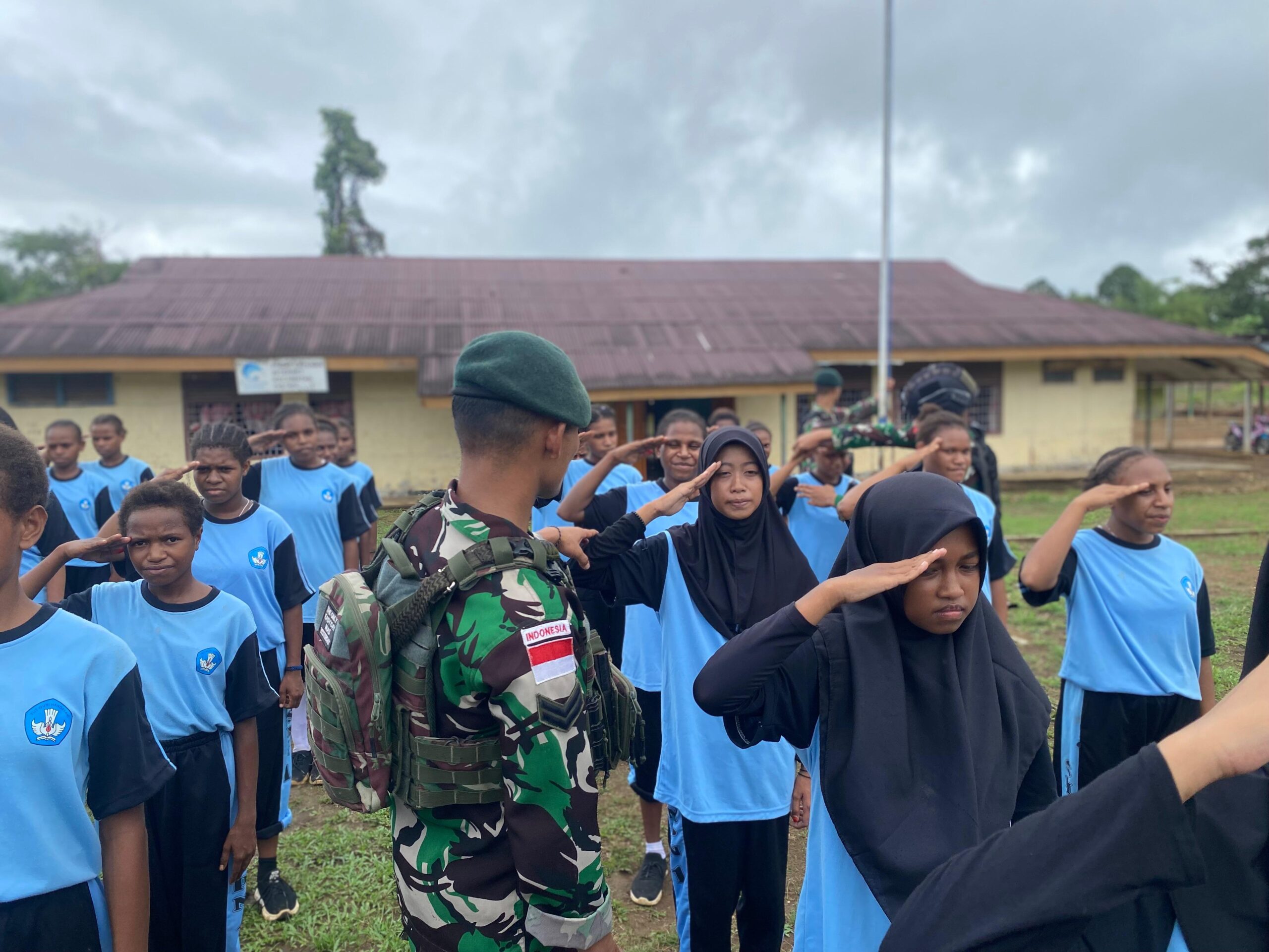Anggota TNI dari Satgas Pamtas Statis RI-PNG Yonif 111/KB Pos Mindiptana melalui Program unggulan Kampung Pancasila bantu memberikan materi tambahan Wasbang di Sekolah SMP Negeri 1 Mindiptana, dalam rangka menumbuhkan semangat belajar dan cinta tanah air kepada murid sekolah,