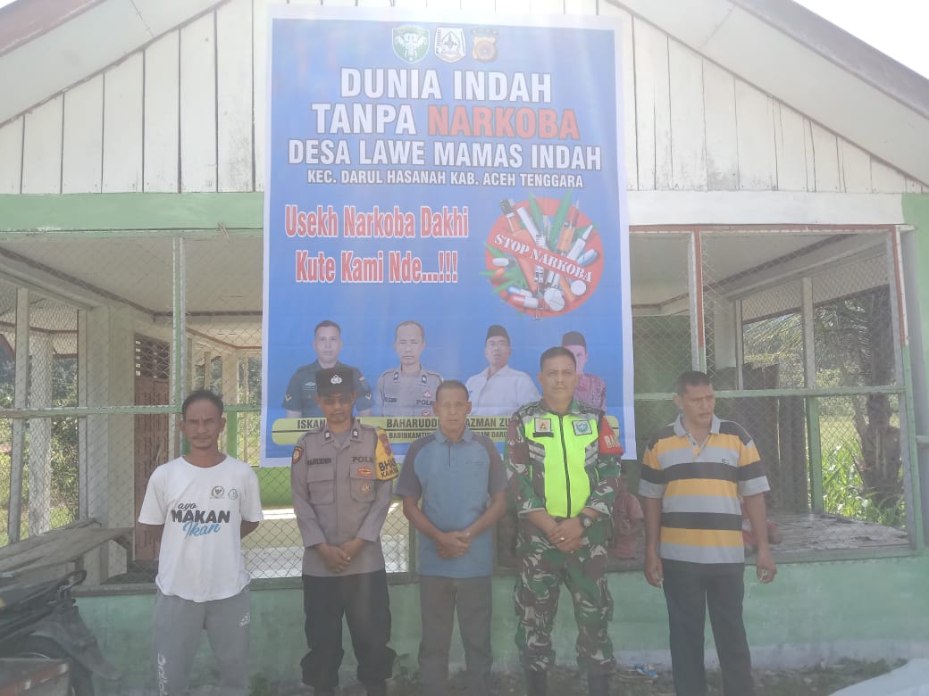 Kutacane – Babinsa Posramil Darul Hasanah Serda Iskandar jajaran Kodim 0108/Agara bersama Bhabinkamtibmas Bripka Kamarudin dan kepala Desa bapak Jamaludin memasang sepanduk Himbauan Stop Narkoba di desa mamas indah Kec, Darul Hasanah Kab, Aceh Tenggara, Rabu (29/05/24).