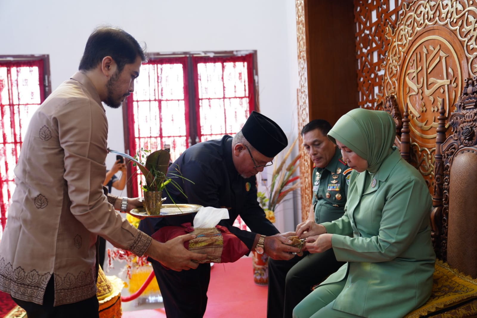Selanjutnya, Pangdam IM dan Ketua Persit Kartika Chandra Kirana Daerah Iskandar Muda di Peusijeuk (tepung tawar) oleh Pj. Bupati dan Ketua MPU Aceh Jaya.