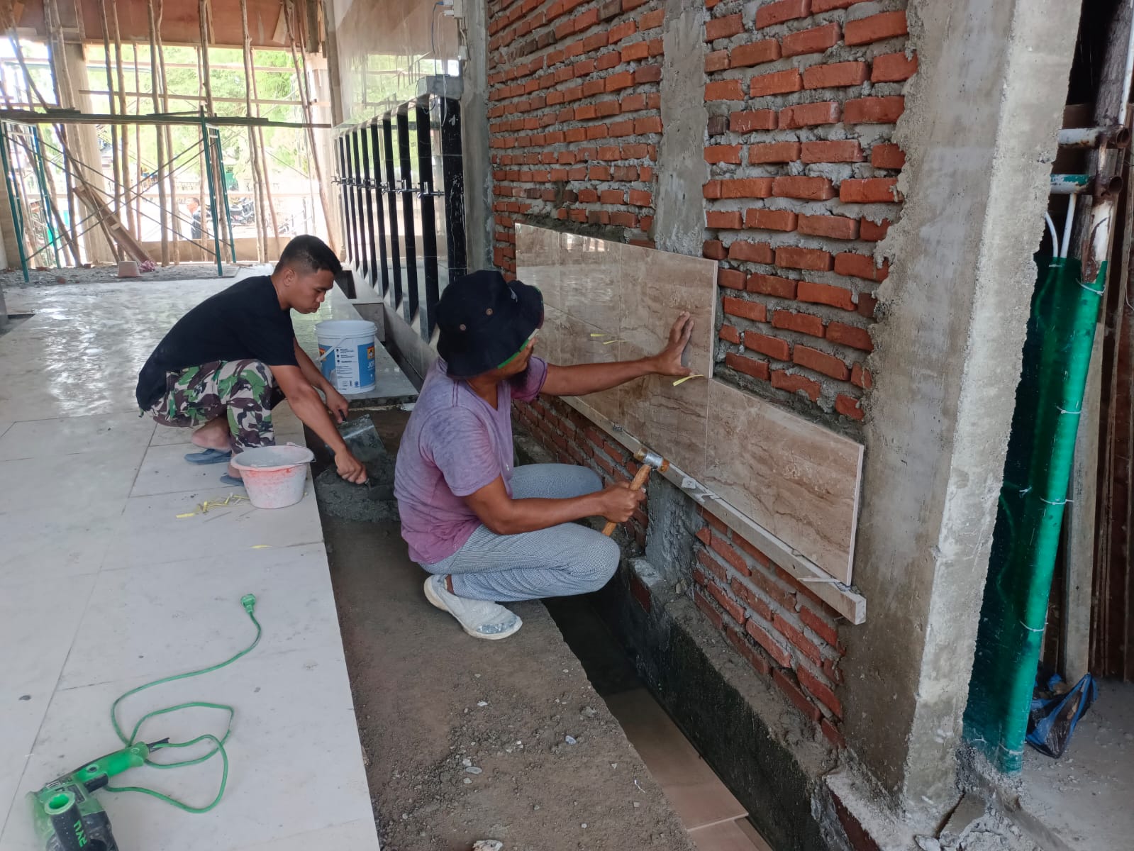 Pasangan dinding keramik Tempat Wudhu, Pasangan bata untuk tangga, Pasangan besi dan mal reng balk dinding atas atap dak dan Cor reng balk dinding atas atap dak.