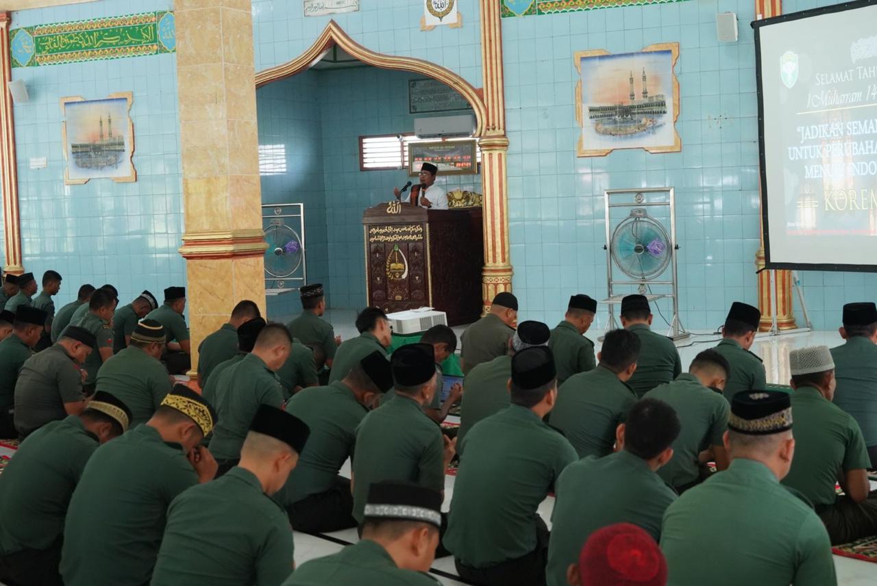 Meulaboh – Dalam rangka menyambut Tahun Baru Islam, Prajurit dan PNS jajaran Korem 012/TU yang beragama Islam mengikuti peringatan Tahun Baru Islam 1 Muharram 1446 H/2024 Masehi dengan tema “Jadikan Semangat Muharram Untuk Perubahan Yang Lebih Baik Menuju Indonesia Emas 2045” yang dilaksanakan di Masjid Al-Ikhlas Makorem, Ds. Ujong Tanoh Darat, Kec. Meureubo, Kab. Aceh Barat, Selasa (09/7/24).