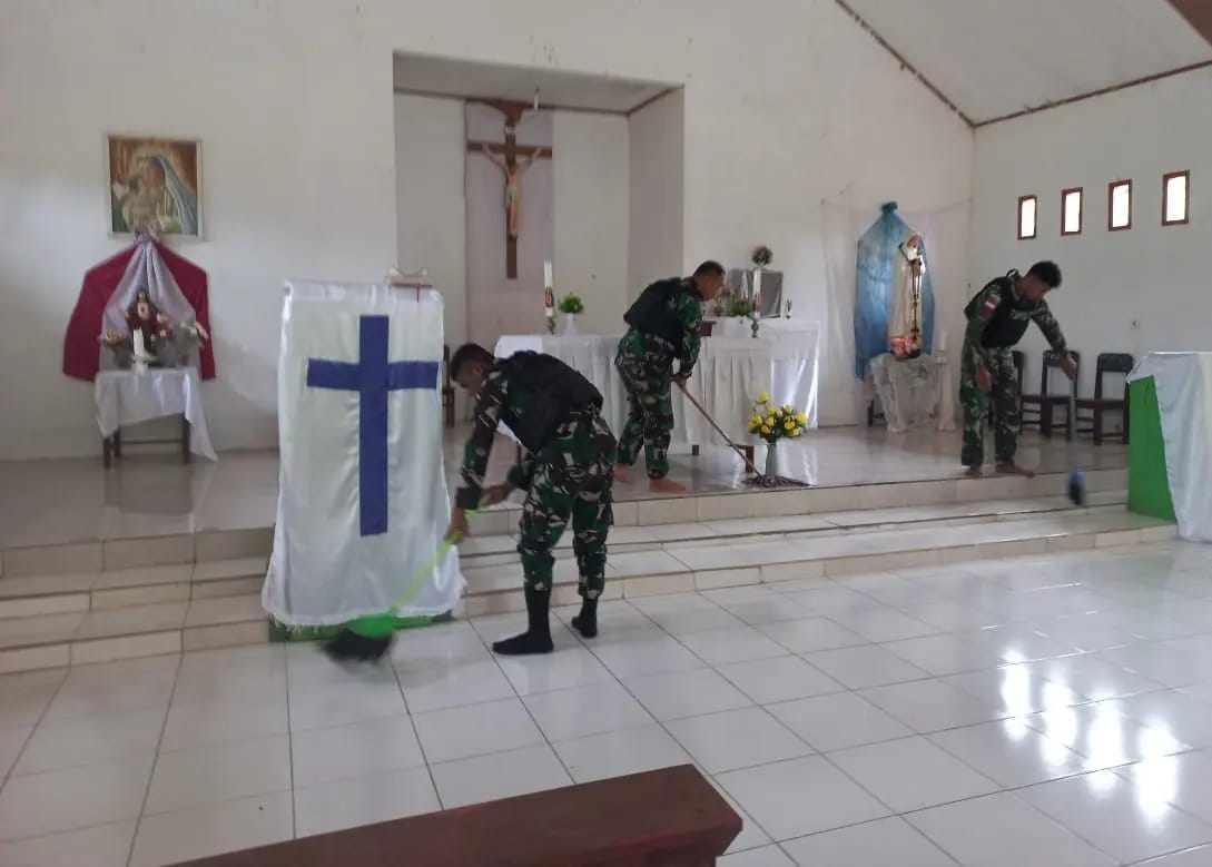 Mimika – Satgas Pam Obvitnas PT. Freeport Indonesia Yonif 116/Garda Samudra Pos Kiliarma bersama masyarakat melaksanakan pembersihan Gereja Katholik Gabriel Didesa Kiliarma, Distrik Agimuga, Kabupaten Mimika, Papua Tengah, Minggu (28/07/2024).