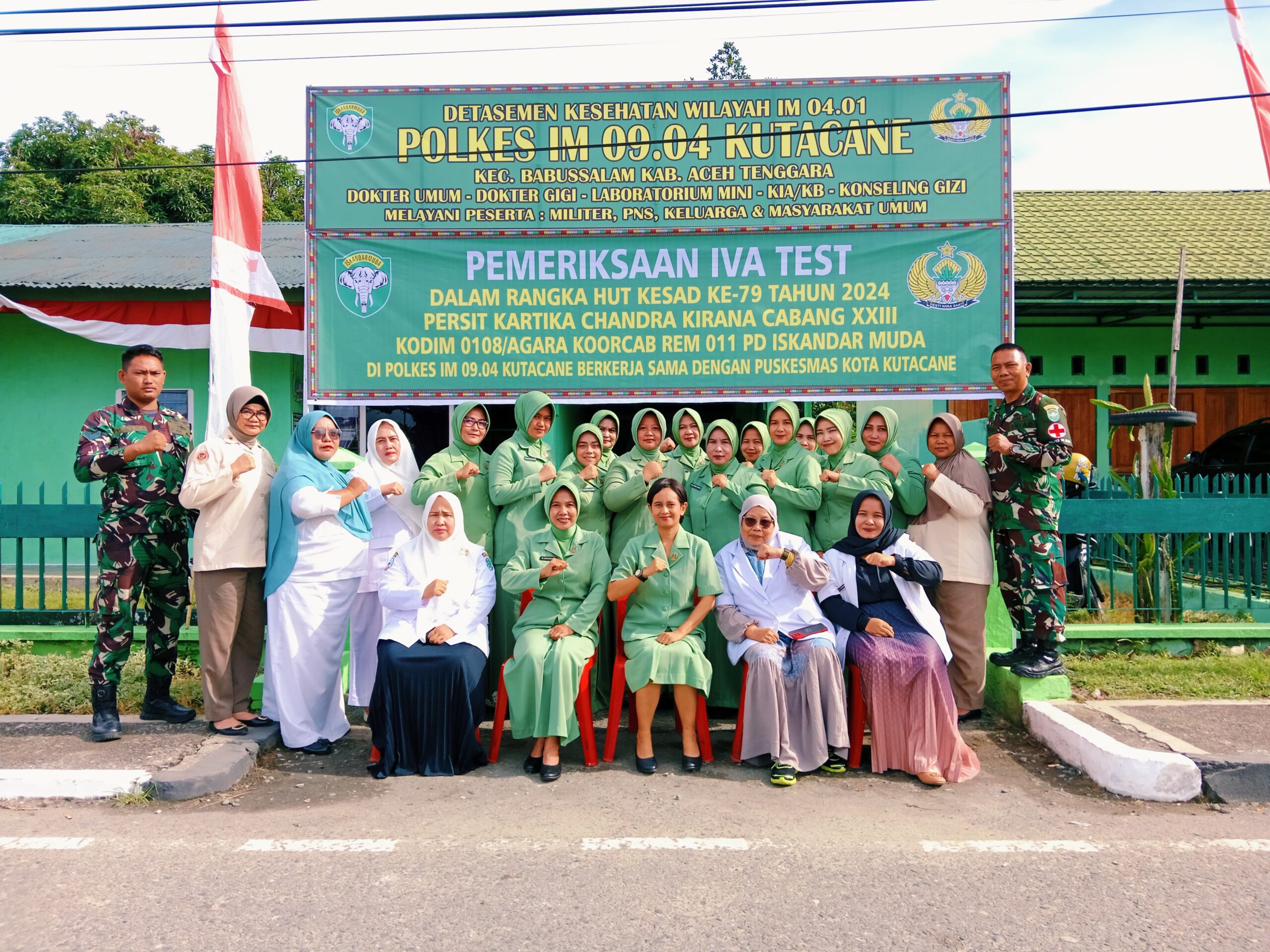 Kapolkes IM 09.04 Kutacane Pelda Ramedam menyampaikan, Kegiatan ini dilaksanakan dalam rangka memperingati Hari Ulang Tahun Kesehatan Angkatan Darat ke- 79 tahun 2024.pemeriksaan IVA test yang dipimpin langsung oleh Ibu Ketua Persit KCK Cabang XXIII Dim 0108/Agara, Ny. Dyan Murdyantoro diikuti oleh seluruh pengurus dan anggota Persit KCK Cabang XXIII.