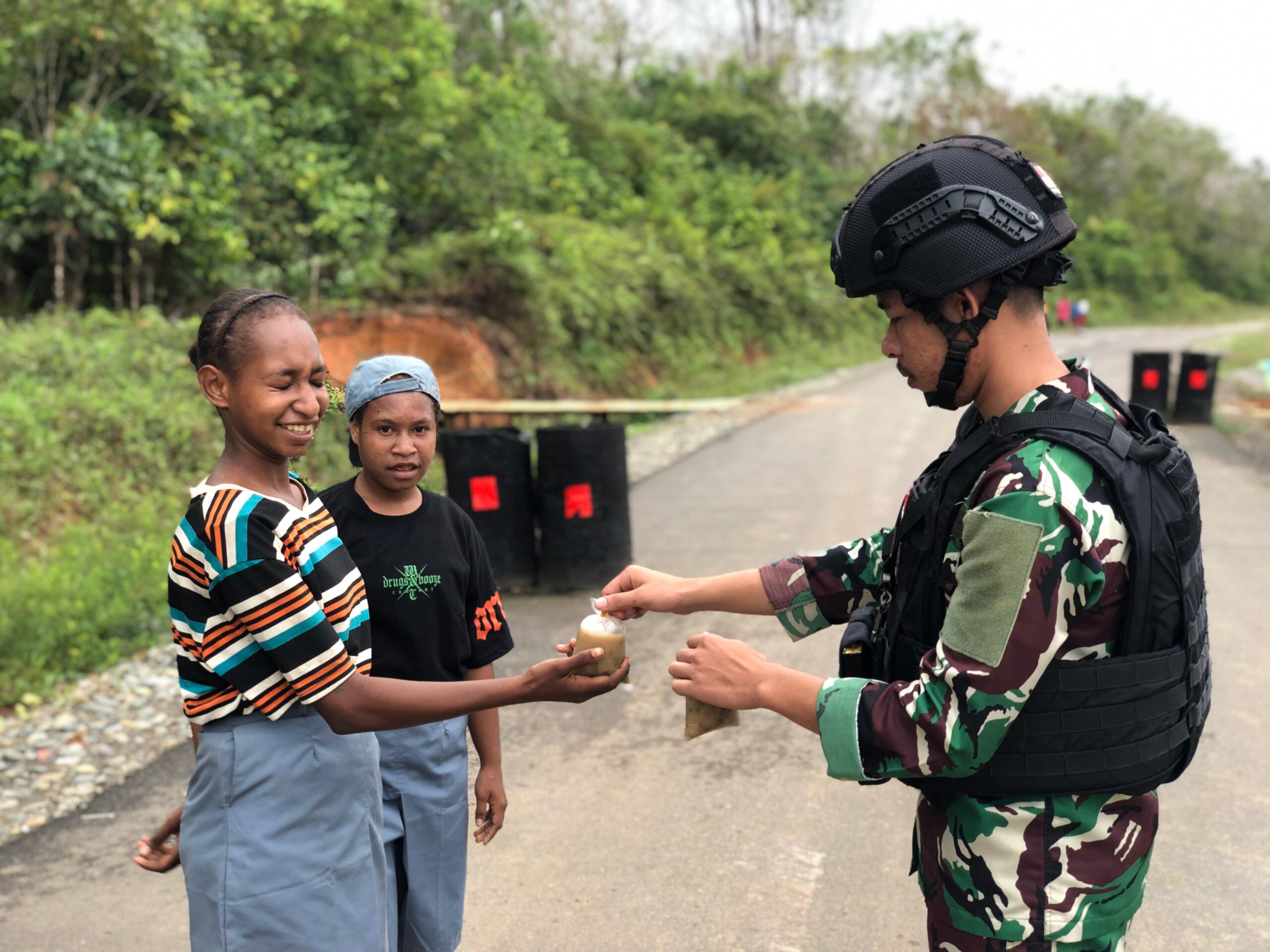Anggota TNI dari Pos Mindiptana melakukan kegiatan berbagi makanan berupa bubur kacang hijau untuk masyarakat yang melintas didepan Pos, bertempat di Kampung Osso Distrik Mindiptana Kab. Boven Digoel Perbatasan Papua Selatan,