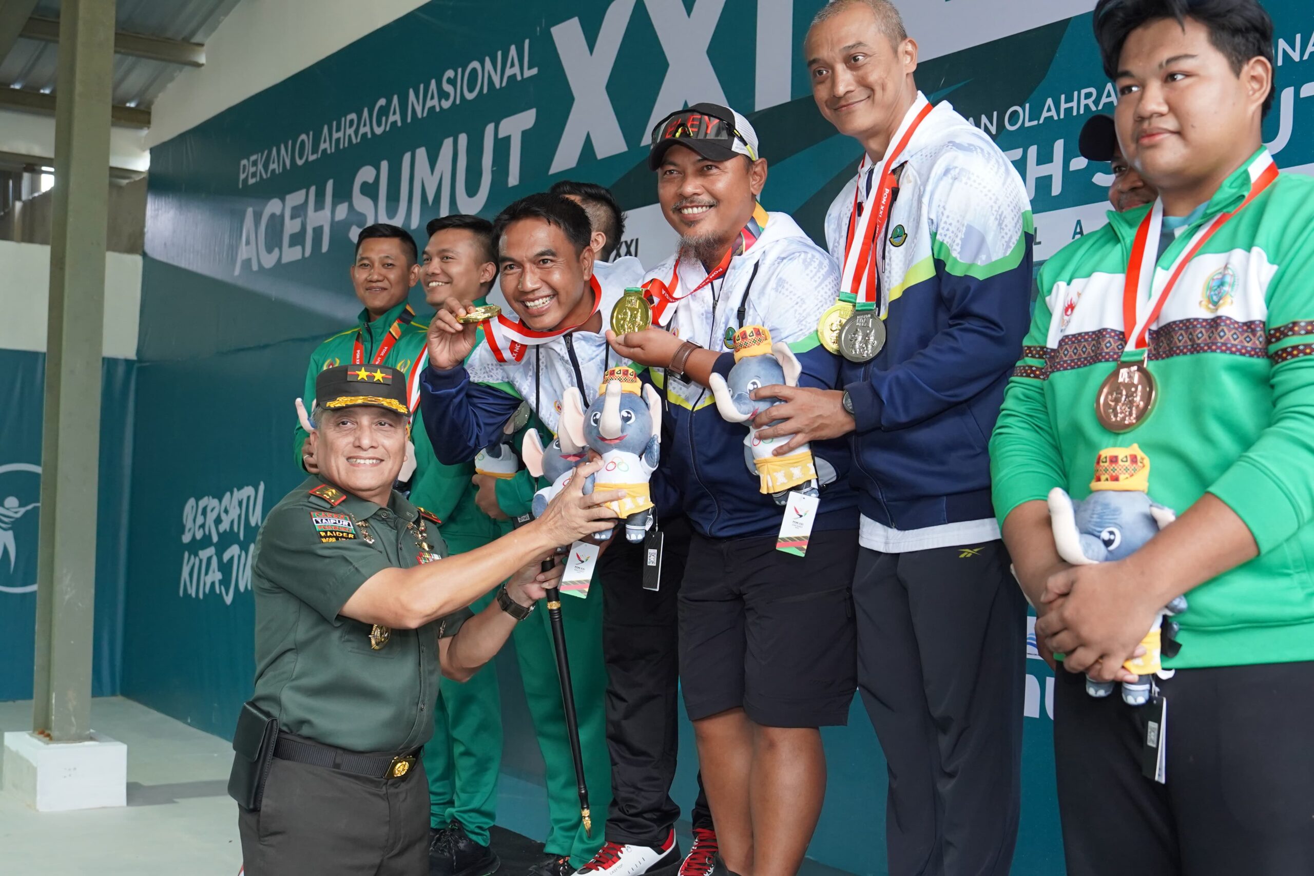 Pangdam IM Kalungkan Medali dan Serahkan Maskot PON XXI Aceh-Sumut kepada Pemenang Cabor Menembak Kategori 25 M Rapid Fire Pistol
