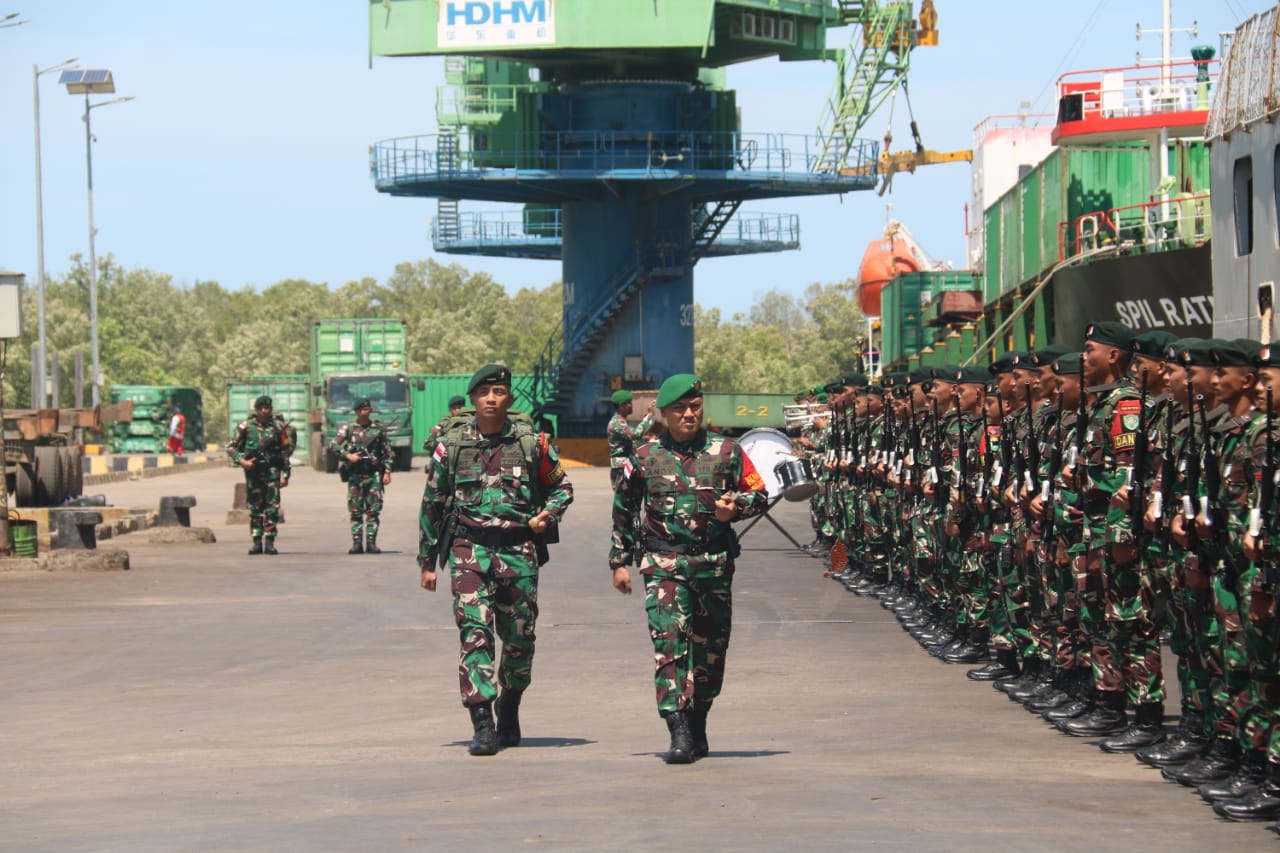 Merauke~ Personil TNI dari Yonif 111/KB dilepas dengan upacara oleh Danrem 174/Anim Ti Waninggap selaku Dankolakops, dipelabuhan Yos Sudarso Merauke, Senin (30/09/2024)