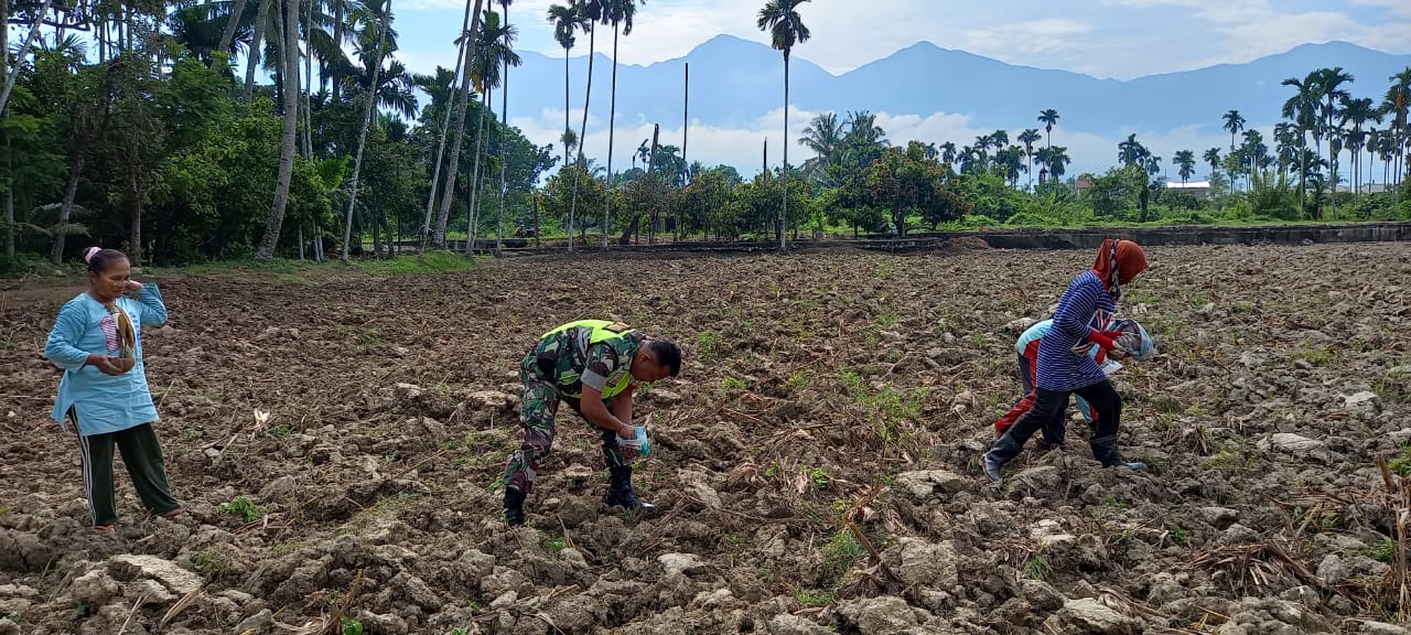 Kutacane – Babinsa Koramil 0108-04/Babussalam Serka Khairul Sinaga jajaran Kodim 0108/Agara Membantu masyarakat Menanam jagung  Milik Ibu  Salimah di Desa.prapat hulu Kec. Babussalam..Kab Aceh Tenggara, Minggu 06/10/24).