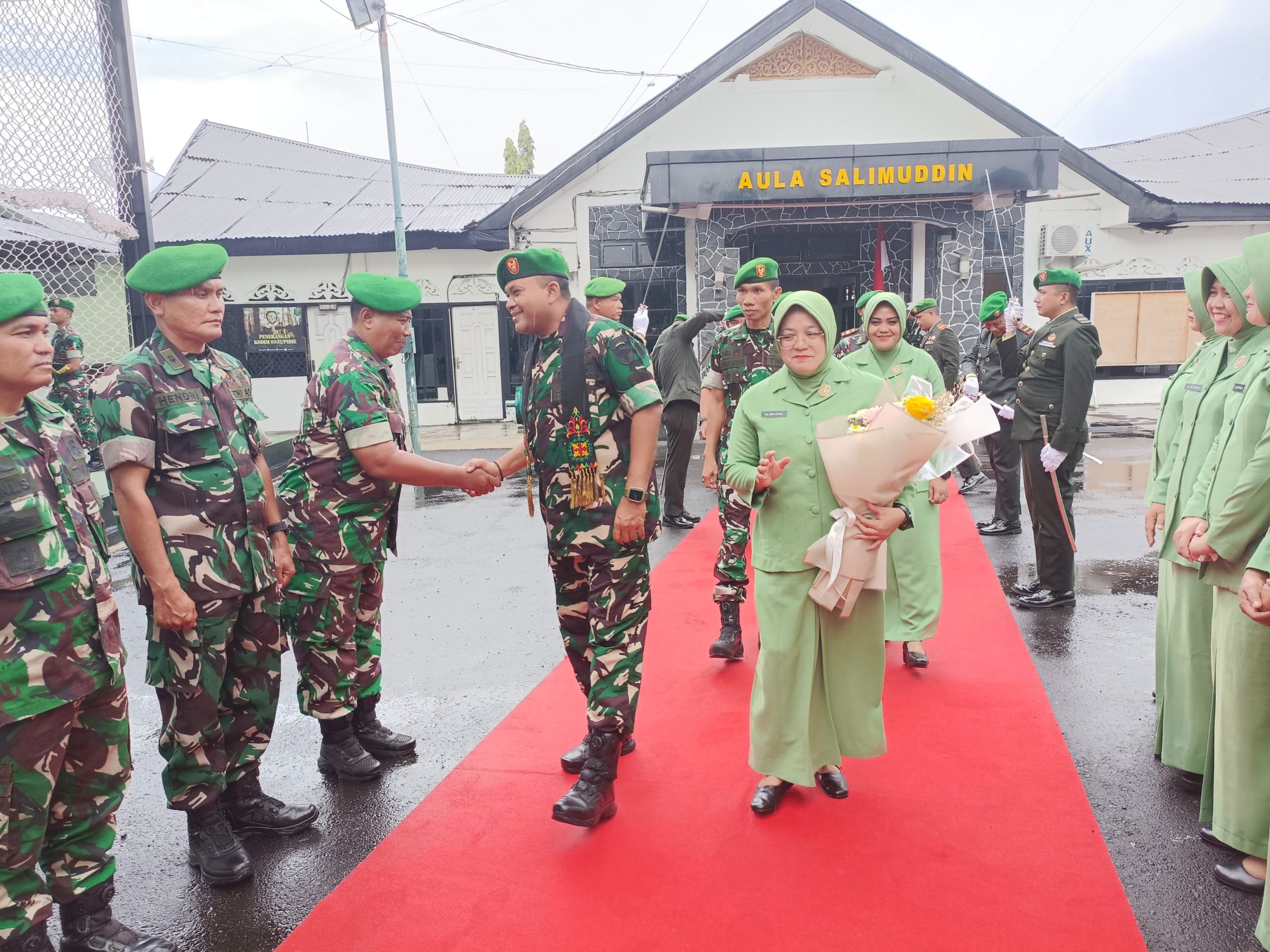 Prosesi dimulai dengan pengalungan bunga dari Dandim baru, Letkol Inf Andi Irsan M.Han., yang didampingi istri, Ny. Tuti Andi Irsan, kepada Letkol Inf Abd. Jamal Husin dan istri, Ny. Devi Jamal. Momen ini semakin menyentuh ketika dilanjutkan dengan prosesi pedang pora dan jajar kehormatan, simbol penghargaan tertinggi dari prajurit Kodim 0102/Pidie kepada Letkol Abd. Jamal dan keluarganya.