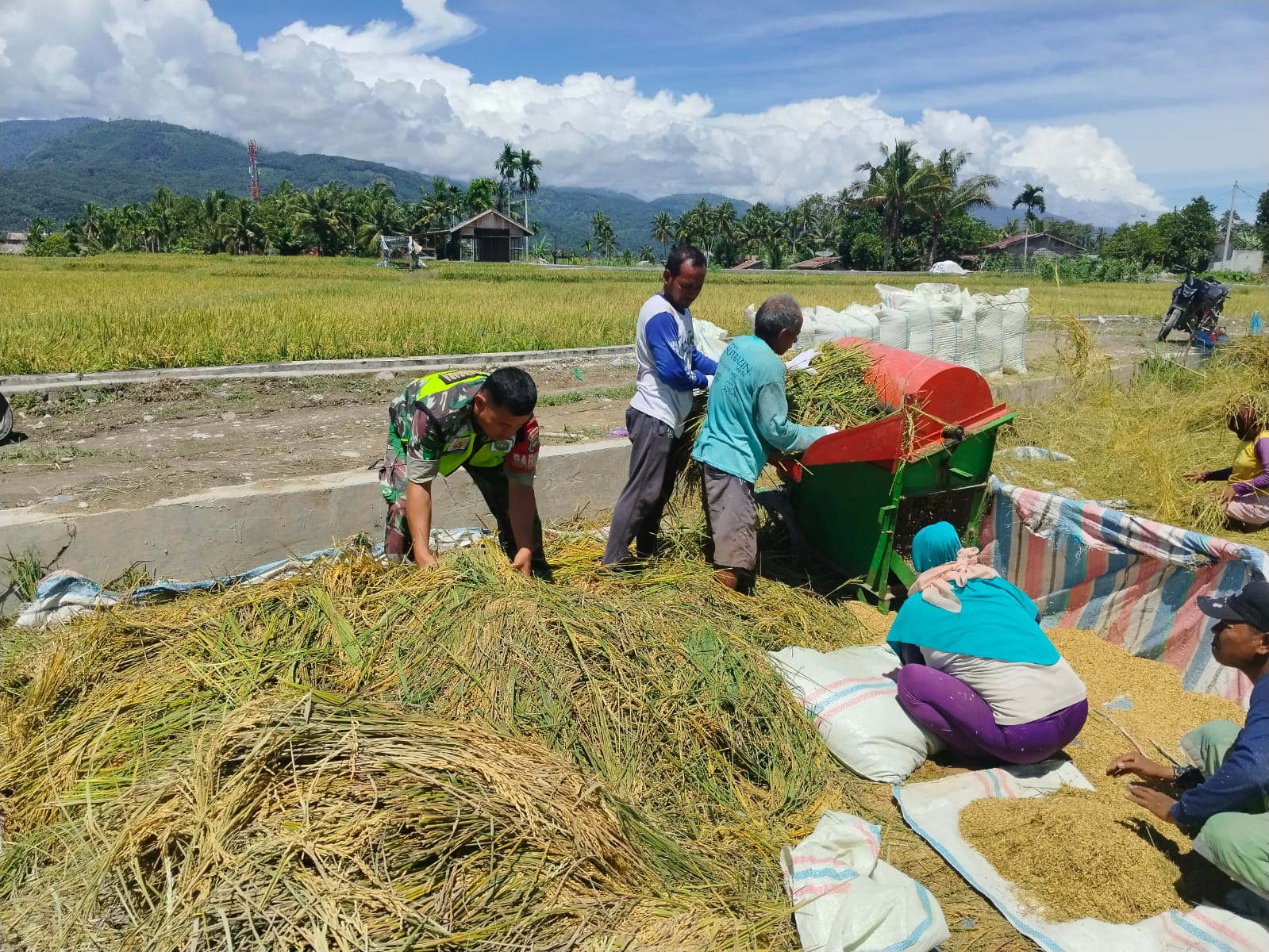Serka Ahmadin menyampaikan Usai memanen padi bersama dengan petani di desa binaannya, Babinsa juga turut serta bantu petani melakukan perontokan padi dengan menggunakan mesin perontok padi di sawah,kegiatan ini adalah merupakan peran serta kami Babinsa dalam upaya khusus pendampingan kepada para petani dan sudah menjadi komitmen kami untuk mendampingi para petani ikut membantu mereka mulai dari pengolahan sawah, penanaman padi sampai dengan panen seperti sekarang ini.ujarnya.