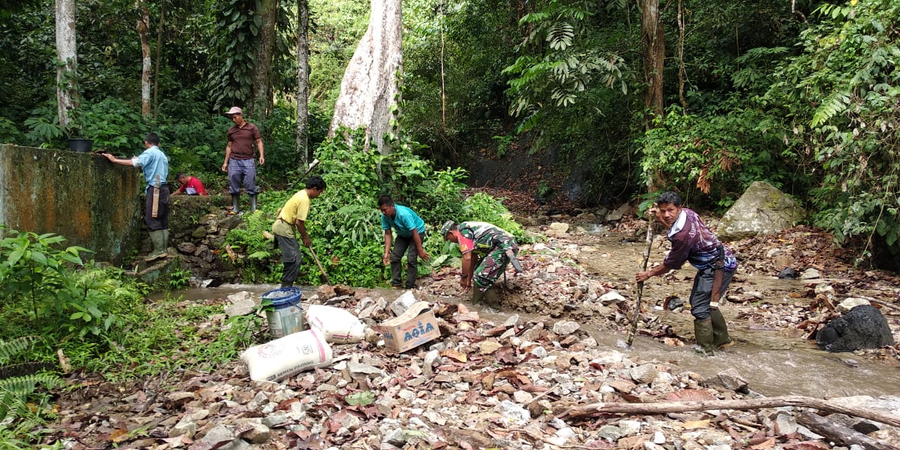 Babinsa bersama warga saling bahu membahu dan bekerjasama membersihkan material pasir dan batu yang menutupi aliran sumber mata air, sehingga air dapat mengalir tanpa adanya kendala ke pemukiman warga yang ada di Desa Rusip.