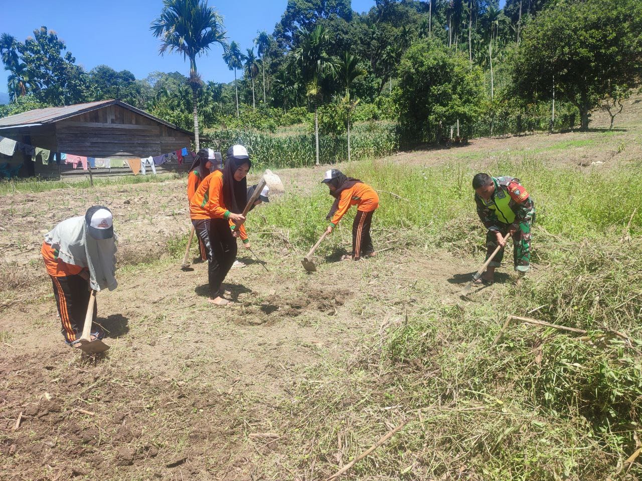 Serka Musliyadi menyampaikan Dalam rangka mewujudkan kemanunggalan TNI dengan Rakyat kita melaksanakan bergotong royong bersama para mahasiswa yang sedang melaksanakan kegiatan kuliah kerja nyata (KKN) membersihkan lahan milik salah satu warga yang nantinya akan ditanami jagung secara bersama – sama.