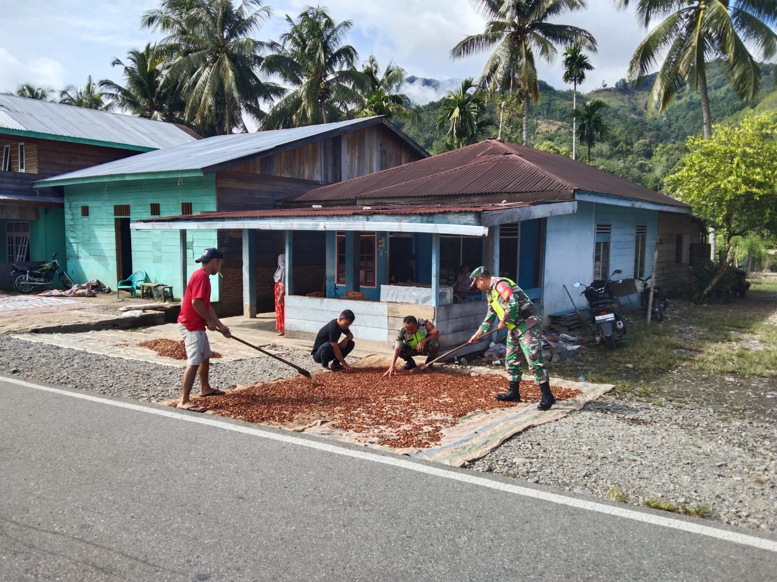 Kutacane – Babinsa Posramil Ketambe Sertu Jaharuddin jajaran Kodim 0108/Agara membantu warga menjemur coklat milik bapak Anwar di desa Leuser Kec Ketambe. kab, Aceh Tenggara, Rabu (30/10/24).