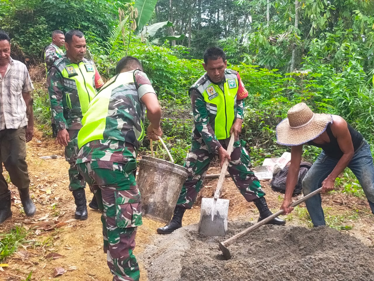 Kutacane – Babinsa Koramil 03/Badar Sertu Rustam jajaran Kodim 0108/Agara melaksanakan gotong royong bersama warga masyarakat dalam pembuatan jalan rambat beton di desa Lawe Bekung kecamatan Badar Kabupaten Aceh Tenggara, Kamis (31/10/24).