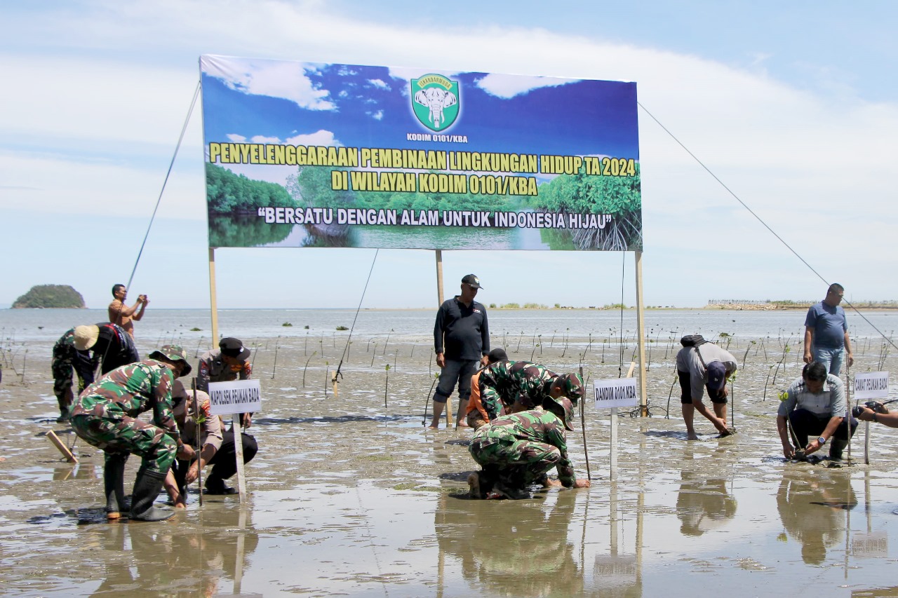 Pasiter Kodim 0101/KBA Mayor Inf Sumastono menyampaikan bahwa penanaman mangrove ini bukan hanya untuk memperindah pesisir, melainkan juga sebagai upaya konkrit dalam menjaga keselamatan lingkungan dan menyiapkan warisan lestari bagi generasi mendatang.
