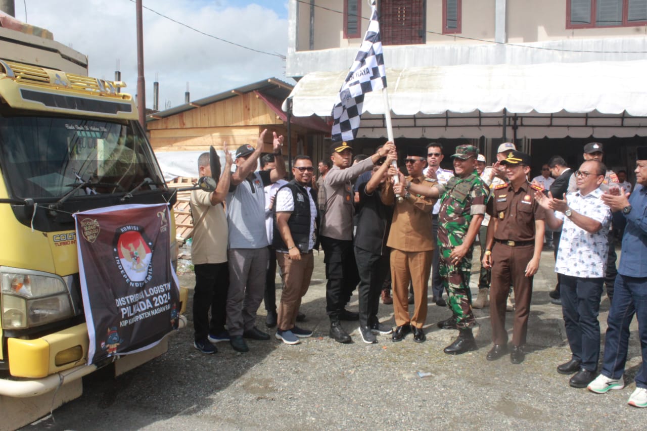 Nagan Raya, Dandim 0116/Nagan Raya Letkol Inf Fairuzzabadi, S.H. bersama Forkopimda Nagan Raya menghadiri pelepasan armada pendistribusian Logistik Pemilu Kada Tahun 2024 yang di Pimpin PJ Bupati Nagan Raya Dr. Iskandar AP, S.Sos., M.Si bertempat di Gudang Logistik KPU di Desa Blang Sapek Kecamatan Suka Makmue ke PPK se Kabupaten Nagan Raya.Senin ( 25/11/2024 ).