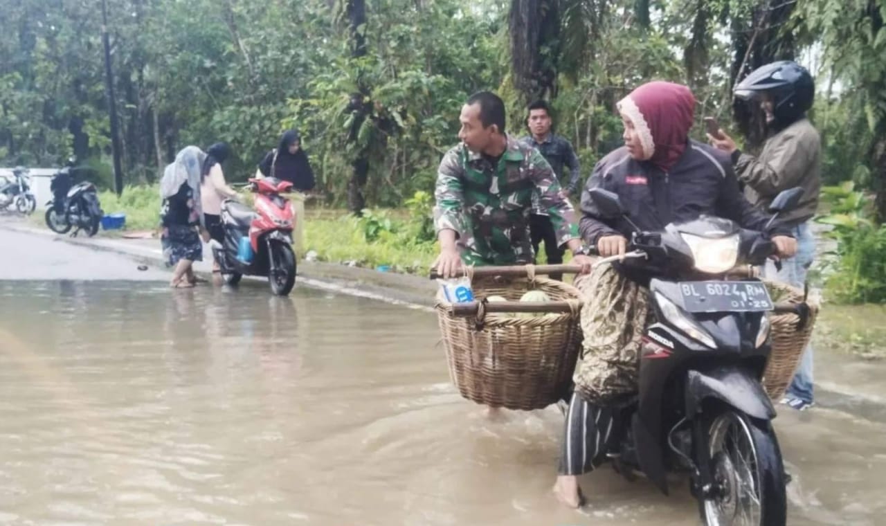 Banjir setinggi 10–20 cm menggenangi jalan lintas utama sepanjang 200 meter, menghambat kendaraan, khususnya roda dua, untuk melintas. Babinsa Koramil 0109-07/Danau Paris, Serda Binto Manalu, segera turun ke lapangan membantu masyarakat terdampak.