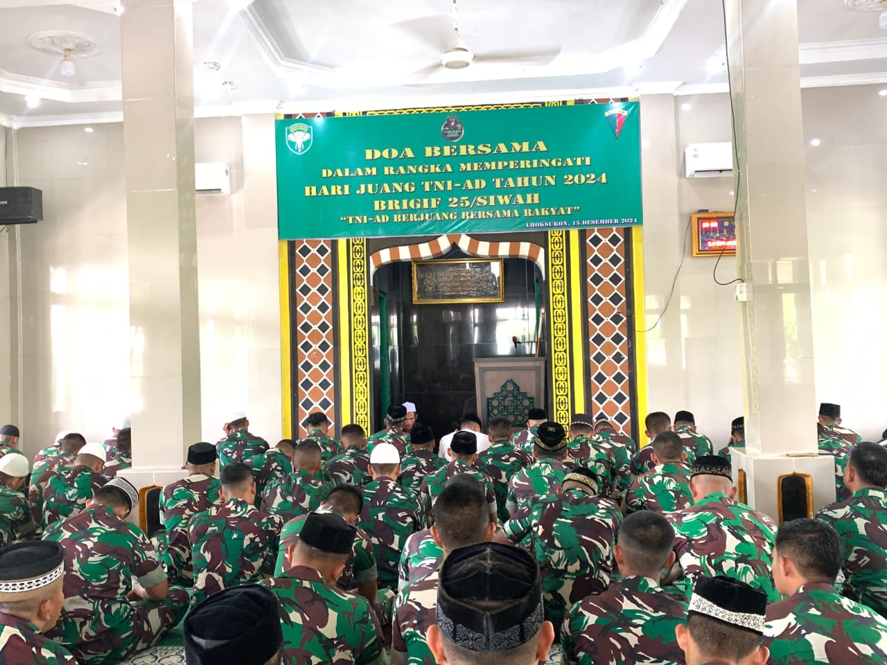 Lhoksukon – Dalam rangka memperingati Hari Juang TNI AD ke 79 Tahun 2024, Brigade Infanteri (Brigif) 25/Siwah menggelar acara doa bersama di Mesjid Al-Ikhlas, Mabrigif 25/Siwah, Blang Aman, Lhoksukon, Aceh Utara, Jumat (13/12/2024).