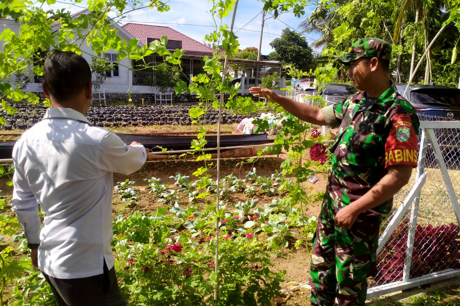 Dengan penuh semangat, Serka Zul Bahri menyusuri area pembibitan yang dipenuhi dengan bibit cabai hijau, tomat, dan berbagai jenis sayuran lainnya. Kunjungan ini bukan hanya sekadar peninjauan, tetapi juga wujud nyata kepedulian TNI dalam mendukung ketahanan pangan di tingkat lokal.