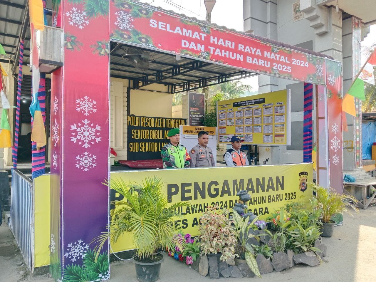 Seperti yang terlihat di Pos PAM Perbatasan Pos Kota hari ini Personel Bintara Pembina Desa (Babinsa) jajaran Kodim 0108/Agara turun ke wilayah binaan untuk turut serta mendampingi dan membantu Personel Polres Agara untuk melaksanakan kegiatan Pos PAM Terpadu Natal 2024 dan Tahun Baru 2025 bersama Aparat Terkait.