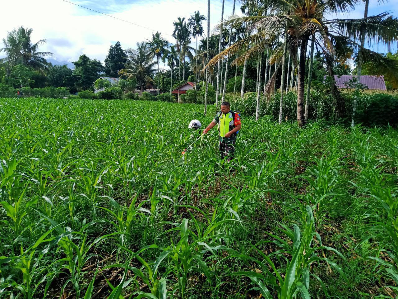 Kutacane- Babinsa Koramil 0108-02/Bambel Sertu Aliye jajaran Kodim 011-0108/Agara melaksanakan pendampingan kepada petani dalam penyemprotan gulma jagung milik bapak Sadiman Desky anggota Poktan Sade Ate di Desa Pulo Perengge, Kecamatan Bambel, Kabupaten Aceh tenggara, Rabu (08/01/2025).