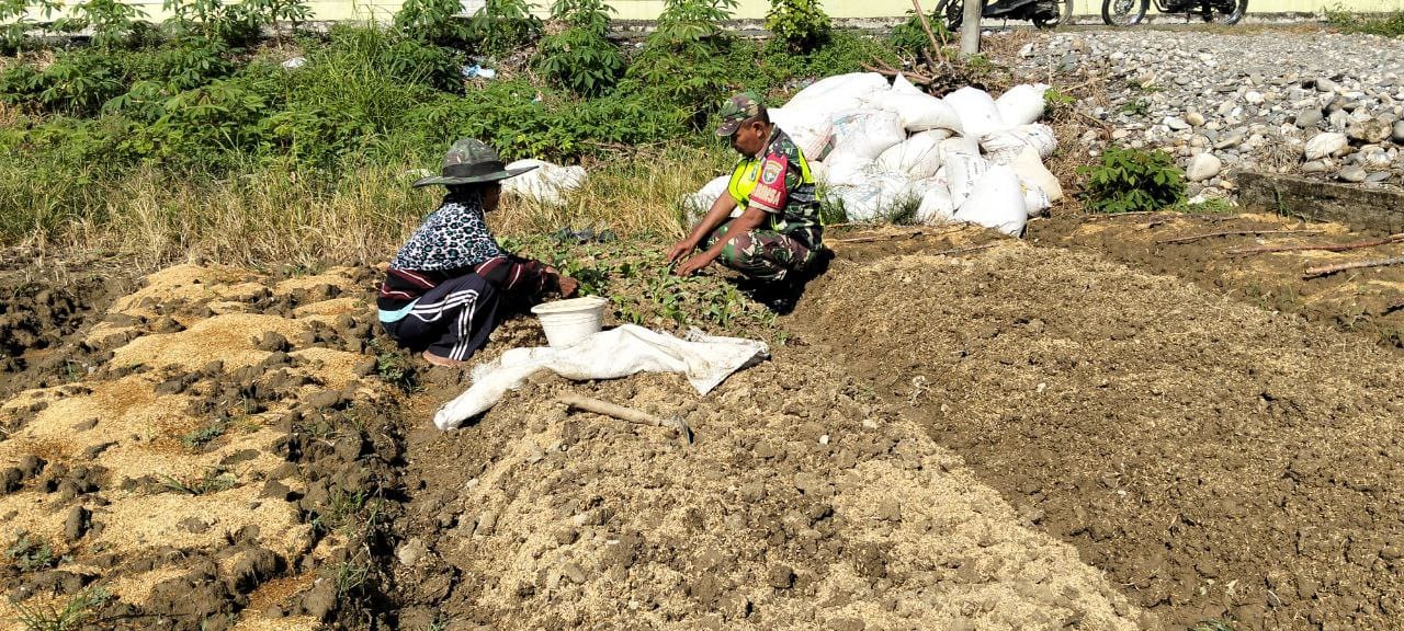 Sertu Dedi Susilo menyampaikan, Dalam upaya mendukung Program Ketahanan Pangan, Babinsa turun langsung membantu petani melaksanakan penyiapan bedengan di lahan salah satu warga desa binaannya.