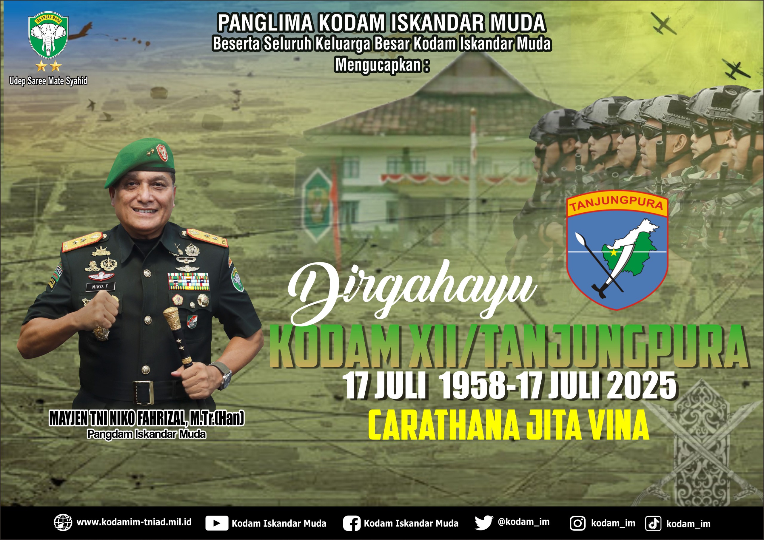 Beranda Berita Utama DIRGAHAYU KODAM XII/TANJUNGPURA Berita Utama DIRGAHAYU KODAM XII/TANJUNGPURAKodam IM17 Juli 2025 KomentarBaca JugaPangdam Iskandar Muda Beri Motivasi kepada Casis Bintara PK TNI AD Gelombang II 2025Kodam Iskandar Muda percepat pembangunan irigasi Tersier di Aceh Timur.Pangdam Iskandar Muda Buka Persami dan Pelatihan Bela Negara Korps Kadet RI di Rindam IM