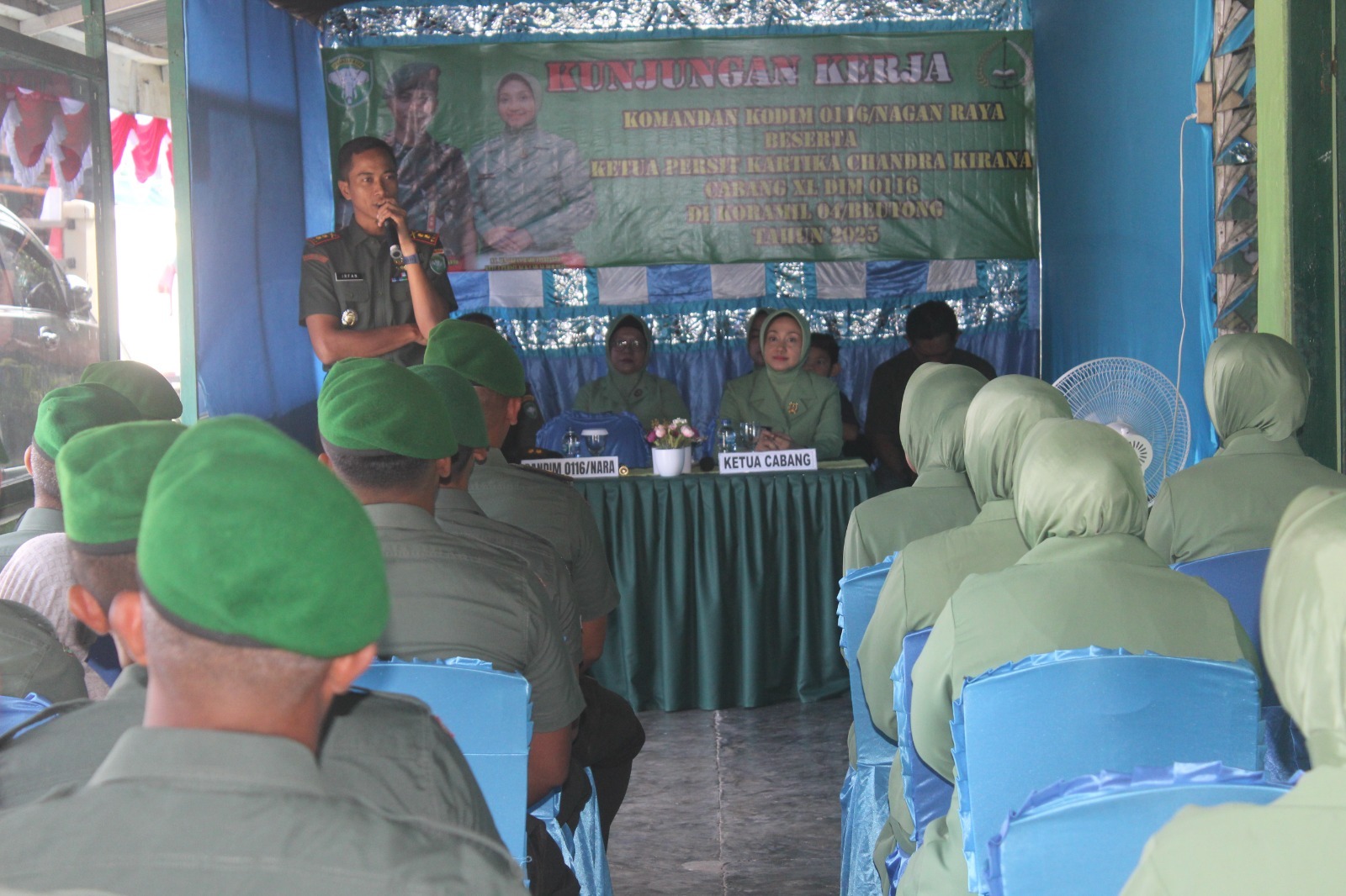 Nagan Raya, Bangun Solidaritas Komandan Kodim 0116/Nagan Raya Letkol Inf Irfan Hade Fitrianto berserta Ketua Persit KCK Cab XL Dim 0116/Nagan Raya Ny. Ien Irfan didampingi Perwira Staf Personil Kapten Inf Amrin dan Pasi Intel Letda Inf Darmawan melaksanakan kunjungan kerja ke Koramil 04/Beutong, Selasa (05/08/2025).