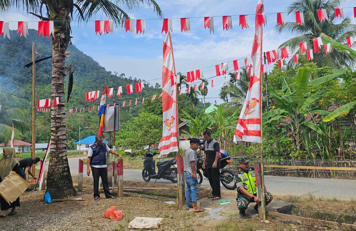 Memeriahkan HUT ke-80 RI, Babinsa dan Perangkat Desa Buluh Didi Kluet Timur Hias Kantor Keuchik dan Gampong Bernuansa Merah Putih