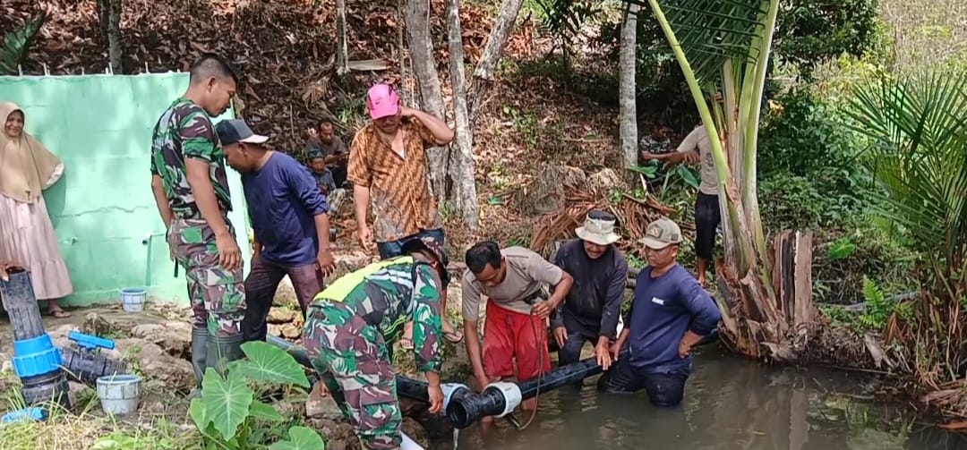 Kutacane — Babinsa Koramil 0108-05 Lawe Alas Serda Kaliman jajaran Kodim 0108/Agara melaksanakan manunggal Air mengalirkan air bersih untuk warga masyarakat di desa Lawe Kongker Kecamatan Lawe Alas Kabupaten Aceh Tenggara, Kanis (14/08/2025).