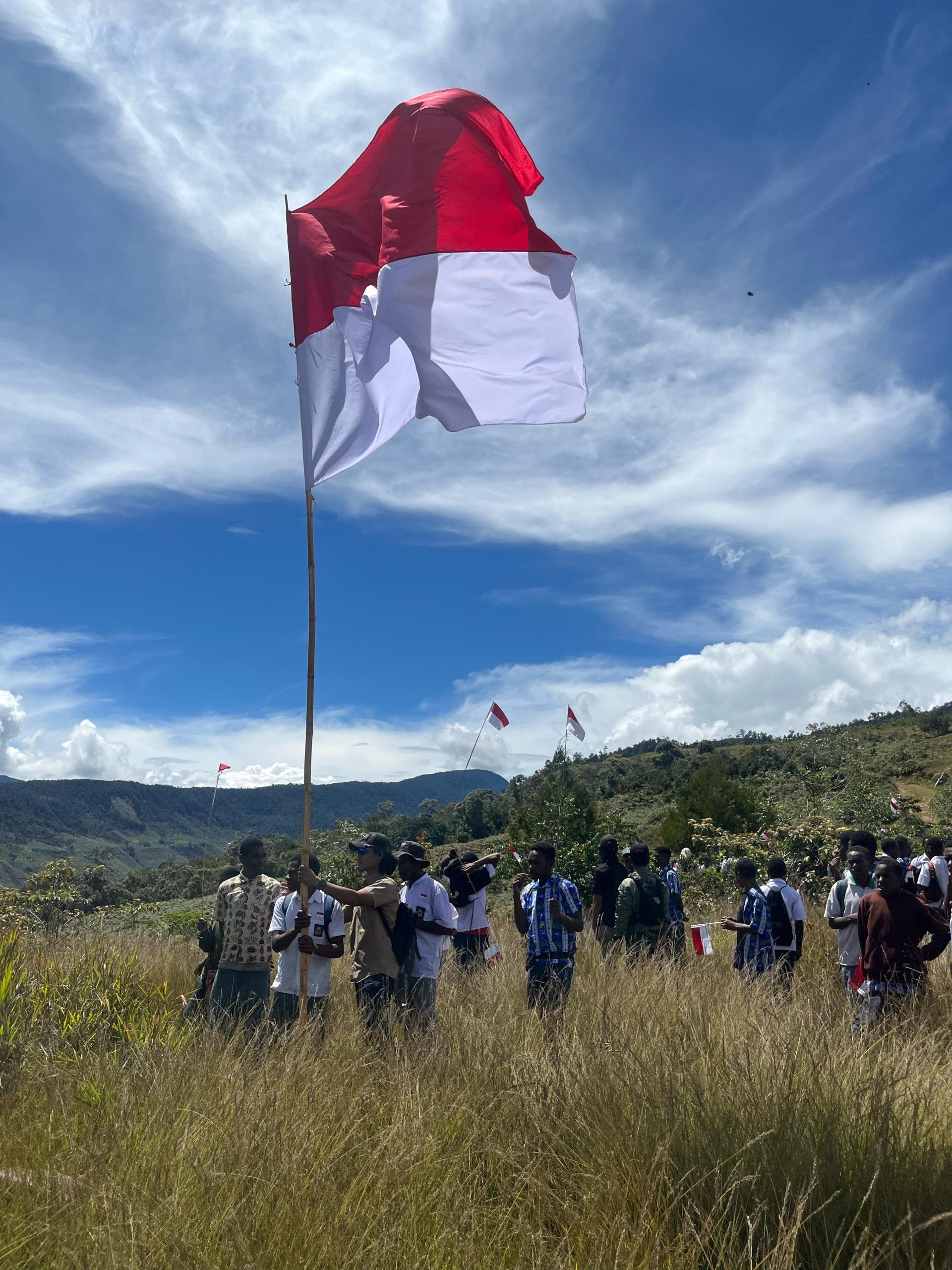 Papua Tengah, Ditengah semangat warga dalam menyambut Hari Kemerdekaan Republik Indonesia yang ke 80 tahun, Satgas Yonif 112/DJ beserta aparat keamanan setempat serta siswa/siswi dan masyarakat yang ada di Distrik Ilu melaksanakan pengibaran Bendera Merah Putih di Bukit Natal Distrik Ilu, Kabupaten Puncak Jaya, Provinsi Papua Tengah, Sabtu. (16/08/2025).