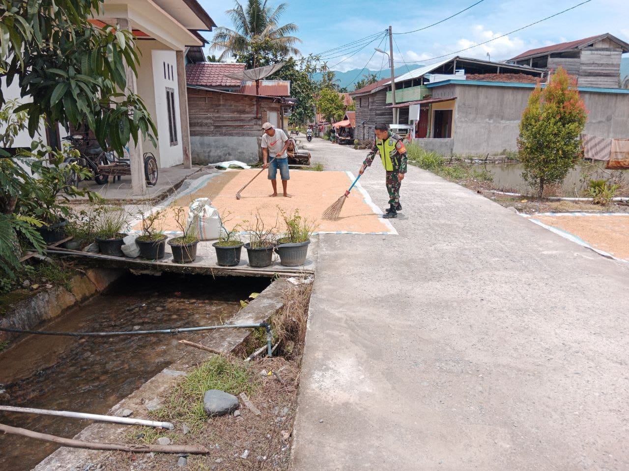 Kutacane – Babinsa Koramil 0108-05 lawe alas Serda Riki Ariansyah membantu pok tani menjemur padi jenis impari 32 milik ibu Salmah di Desa paye munje Kecamatan Lawe alas kavupatrn Aceh Tenggara, Selasa (19/08/2025).