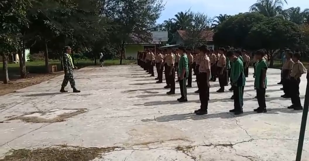 ACEH TAMIANG,MEDIA CENTER DIM 0117ATAM- Babinsa Koramil 02/Karang Baru Sertu Barasa melaksanakan kegiatan pemberian materi Peraturan Baris Berbaris (PBB) dan Wawasan Kebangsaan (Wasbang) kepada siswa siswi SMP 8 Karang Baru. Selasa (16/09/2025)