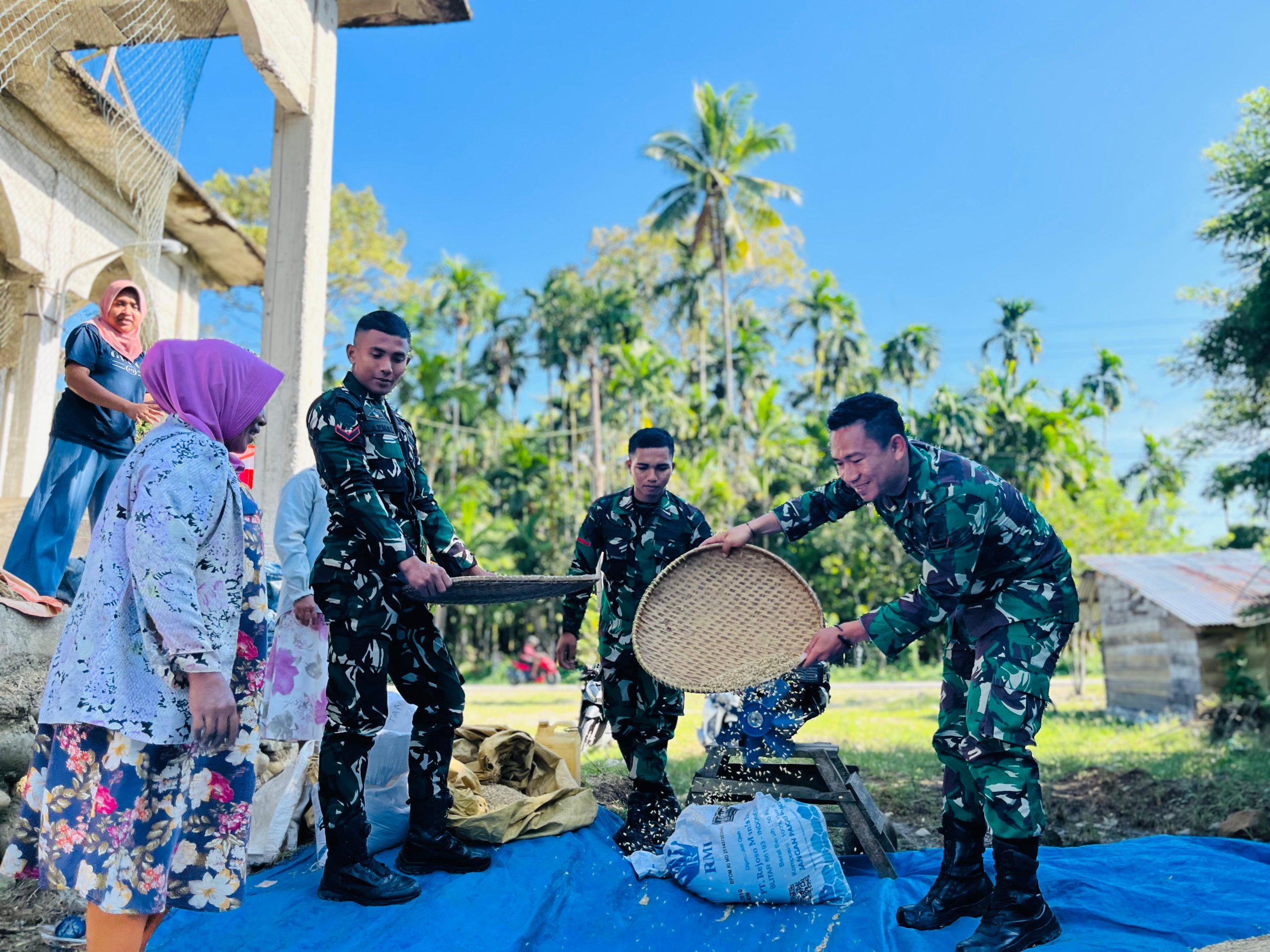 Dengan semangat gotong royong, prajurit Yonif TP 857/GG turun langsung membantu warga menampi padi dan membersihkan gabah menggunakan alat sederhana. Suasana terlihat akrab dan penuh kekompakan antara prajurit dan warga yang bekerja bersama di lapangan.