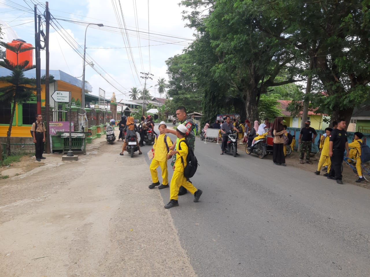 Kami membantu menyeberangkan mereka menuju sekolah, dikarenakan mereka masih tergolong anak dibawah umur yang butuh pengawasan, kita khawatir akan keselamatan mereka yang kebetulan sekolah tersebut terletak di sebrang jalan raya jadi sangat rawan kalau tidak dibantu untuk menyeberang,”ungkap Babinsa